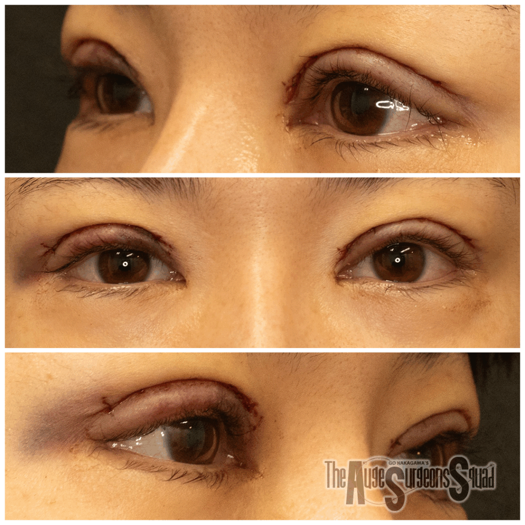 手術直後です。この様にまぶたを開いていれば目頭・目尻両端の数ヶ所しか糸は見えないので、サングラスや太めの縁のしっかり有るメガネを使えば、近所に買い物程度の外出は問題になりません。ただし職場や家族にバレずに手術を、というのは難しいです。